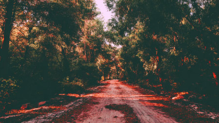 Sunlit dirt road winding through dense forest with warm autumn foliage and dappled shadows
