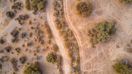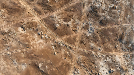 Aerial view of the sandy ground with tire tracks, with sparse vegetation and shrubs in between. The background features a large area without plants, creating an open space for racing or riding vehicles. Shot with a Sony Alpha A7 III camera using a G Master lens, the photo captures intricate details with sharp focus on each track mark. It's a high-resolution image that highlights the texture of the sand, showcasing the vastness of the desert landscape. --chaos 30 --ar 16:9 --quality 2 --stylize 500 --v 6.1 Job ID: fd3daace-e8a7-491c-b569-fc90299aee3d