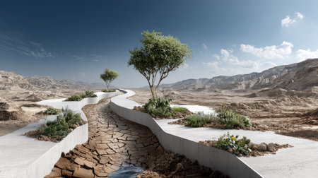 This captivating image showcases a surreal landscape where cracked ground meets vibrant greenery. It emphasizes the resilience of nature amid contrasting elements.