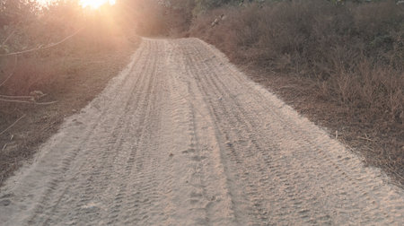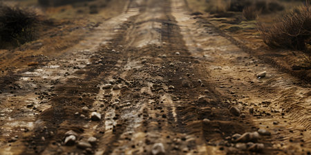 Dusty dirt road with potholes stretching towards the horizon in cinematic style