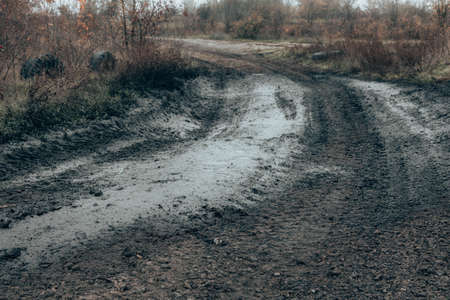 Dirty broken road from big rubber tires of car, tractor and tank. Dirty liquid puddle after rain at the base of the season