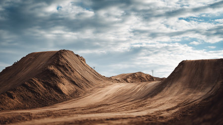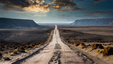 Journey along a solitary dirt road, amidst the desolation of the desert, a path to the unknown. Ai Generated.