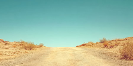 AI Generated. Dusty road stretching toward the horizon under bright sun in a desert landscape