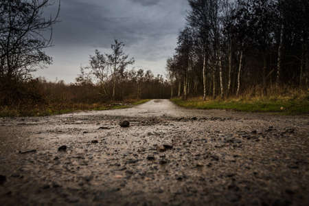 Closeup Photography of a Countryside Road in Sunny Winter Day with a Little Snow on the Sides an Trees in the Background