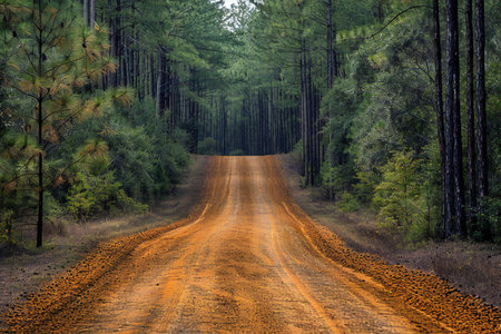 Dirt road through the pine forest in the morning, Thailand.