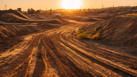 Wheel tracks on the sand of a construction site at sunset. Road in the sand.