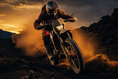 A dynamic shot of a motocross rider navigating a challenging dirt track as the sun sets, creating a dramatic, golden-hour atmosphere. Dust and speed define this action-packed scene.