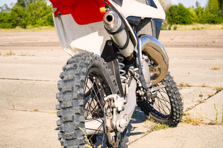 Studded cross motorcycle wheel on the ground level. Focus on the rear wheel. Details of a motorbike closeup. Traveling concept. Driving the empty road on a tour journey. Discover the beauty of earth.