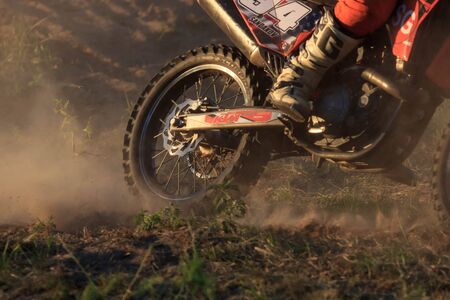 Ukrainian professional motorcycle rider driving on Enduro motorbike, outdoors at hot summer day. Motocross sport