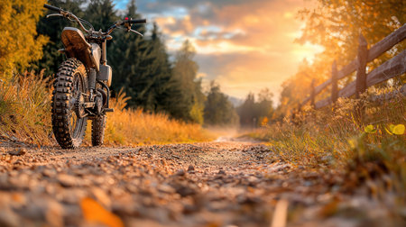 Motorcycle on the dirt road in the autumn forest at sunset.
