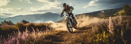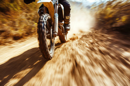 A dirt bike rider races across a dusty track, their bike leaving a trail of brown dust. The rider is wearing protective gear. Dynamic and adventurous.