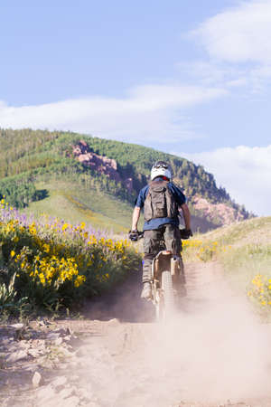 Enduro rider on the road in the mountains. Extreme sport.