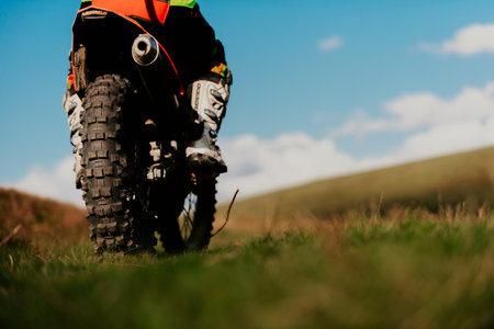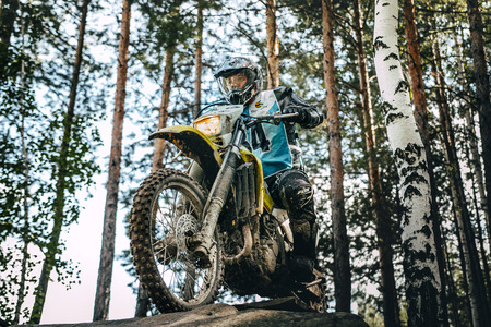 Ukrainian professional motorcycle rider driving on Enduro motorbike, outdoors at hot summer day. Motocross sport