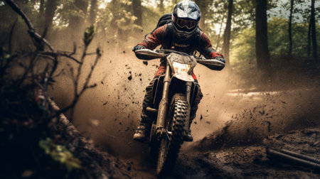 Motocross rider on a dirt road in the forest during the race