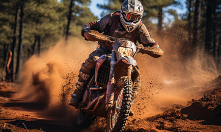 Adult motocross enthusiast riding fast across a sandy off-road trail with dust clouds, capturing power, thrill, and competition.