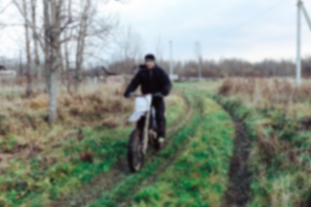Blurred motocross racer accelerating in dirt track on the mountain motocross race in dirt track in day time. Blurred background with bokeh effect.