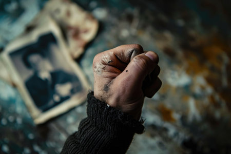A clenched fist gripping a torn photo, symbolizing the frustration and anger resulting from a perceived betrayal
