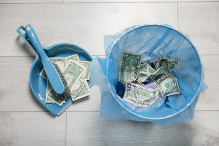 Dollar banknotes in trash bin, dustpan and broom on floor, flat lay