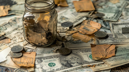 A glass jar contains old currency and loose coins, surrounded by a chaotic array of banknotes, highlighting the nostalgia of past financial transactions.