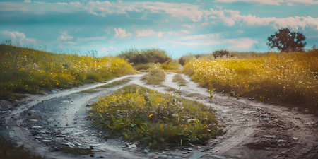 Dusty dirt road with potholes stretching towards the horizon in cinematic style