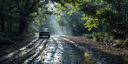 Car on the wet road in the forest with fog and sunbeams