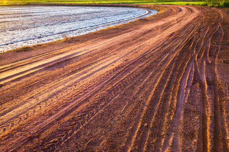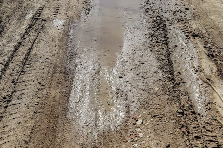 Dirty broken road from big rubber tires of car, tractor and tank. Dirty liquid puddle after rain at the base of the season