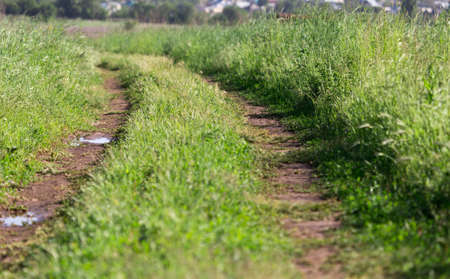 Mud track from a car among a green field after rain.