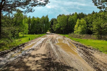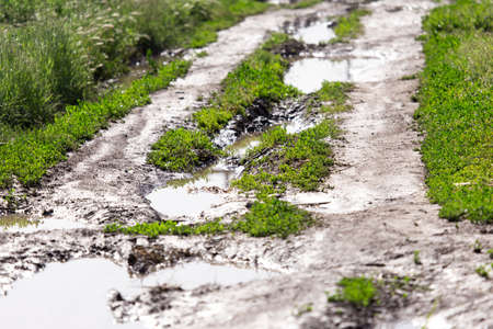 Spring landscape. Dirty spring road. Impassability and mudslides.