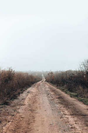 Long dark rural dirt road with mud in fog. Landscape empty countryside