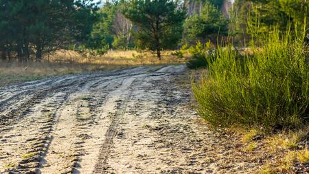 A sandy road in the autumn forest going beyond the horizon