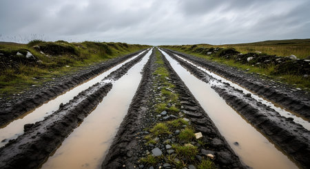 Tire tracks create a winding pattern on a muddy road after rainfall in rural landscape