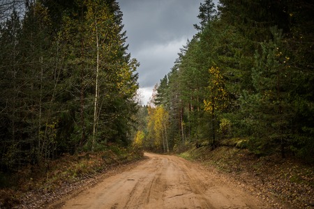 Forest road going through autumn mixed forest