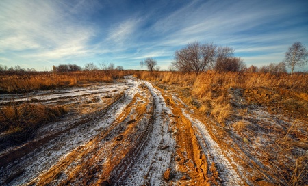 Rural autumn landscape with yellow trees and mud on the road