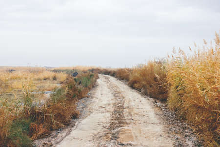 Wet muddy country road. Trip in the countryside