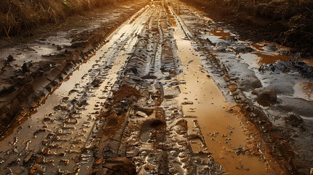 AI Generated. Sunset Landscape Mud Track Path Puddle Reflection