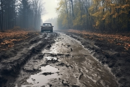 Off road SUV driving through a muddy and scenic landscape with foggy forest background in autumn or