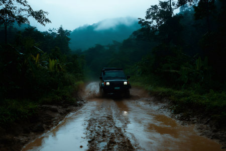 Off road vehicle navigating a muddy trail in a tropical forest, surrounded by lush greenery during the vibrant rainy season