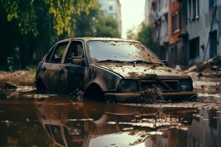 Damaged cars in flooded city street devastation and debris in the aftermath of natural disaster