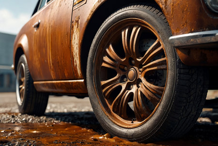 Replacing car's front chassis wheel, close-up. Front wheel of car with maintenance rust showing wear from exposure to elements over time, outdoors. Car auto repair concept. Copy ad text space poster