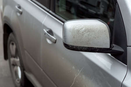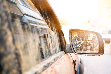 Broken mirror of a dirty vehicle, outdoor close-up shot