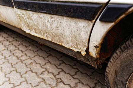 The old car skirt over time until rust. Rust on old ancient car paint rusty steel