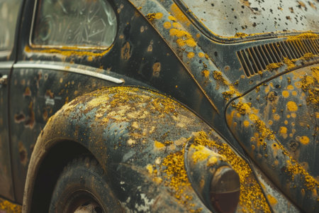 A dirty, old car with yellow paint and a lot of dirt on it