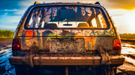 Rusted out car with graffiti on it's windows and license plate. Generative AI.