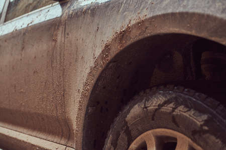 Close-up of a muddy wheel. Big tire of an off-road vehicle with mud. Splatters of mud on the side of the pick-up. Adventure, outdoor, 4x4, extreme, travel, mountain excursion concept. Vehicle off road