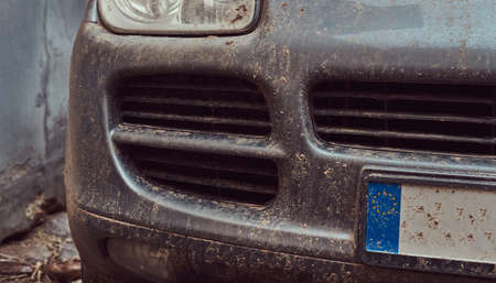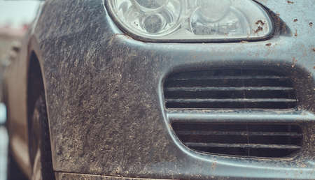 Close-up image of a dirty car after a trip around the countryside