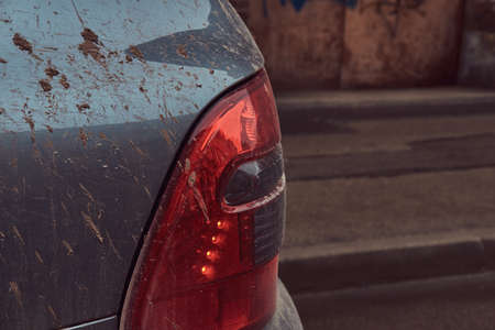 The detail of tail lights of a car during the winter season, dirty with maps from the salt or brine used against snow and ice on the roads.