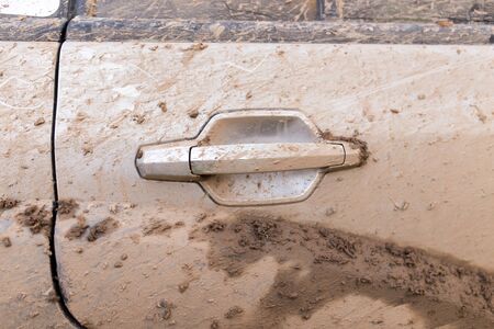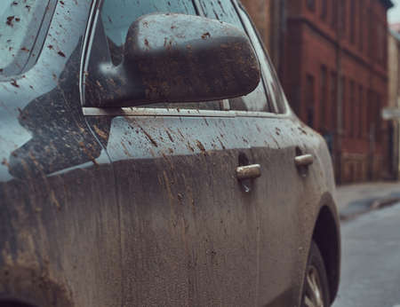 Front door of car is spattered with mud. Close-up. Selective focus.