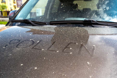 Pollen on vehicle. Word Allergies written on car