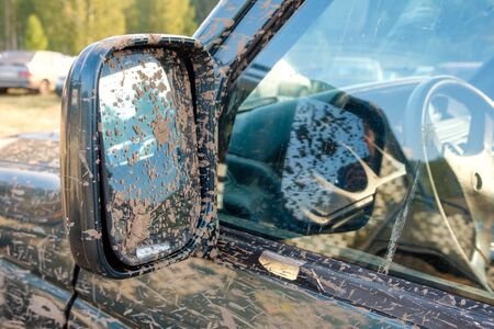 dirty car in the forest the side mirror is covered with dirt. reflection in the side window