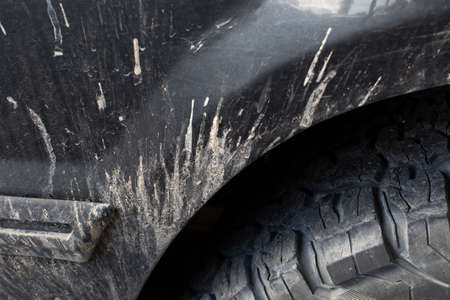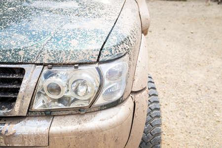 Off road vehicle full of dry mud on the hood. selective focus